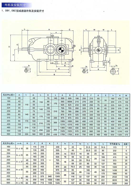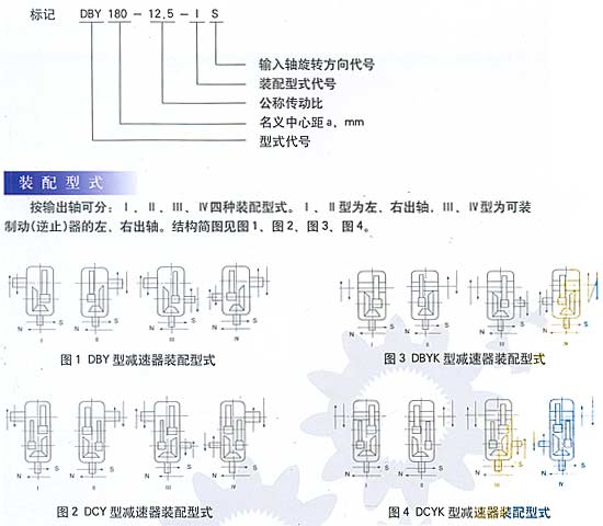 減速器的型號(hào)由型式代號(hào),名義中心距a(末級(jí)中心距),公稱傳動(dòng)比,裝配型式代號(hào),輸入軸旋轉(zhuǎn)方向代號(hào)組成。